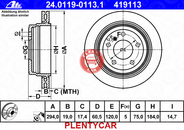 - "Диск тормозной зад.вент.[294x19] 5 отв." - "24-0119-0113-1 " - "ATE" - "шт." - "2"